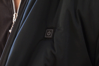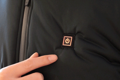 ジャケットの内側にあるポケットにバッテリーをセットし、電源を長押しします。