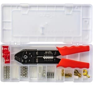 電工ペンチで圧着端子やスリーブをかしめることで、端子のツメが配線に食い込み、外れにくくなります。標準ペンチでかしめてもすぐに外れてしまうので、圧着端子を使った配線作業に用意しておくと便利です。