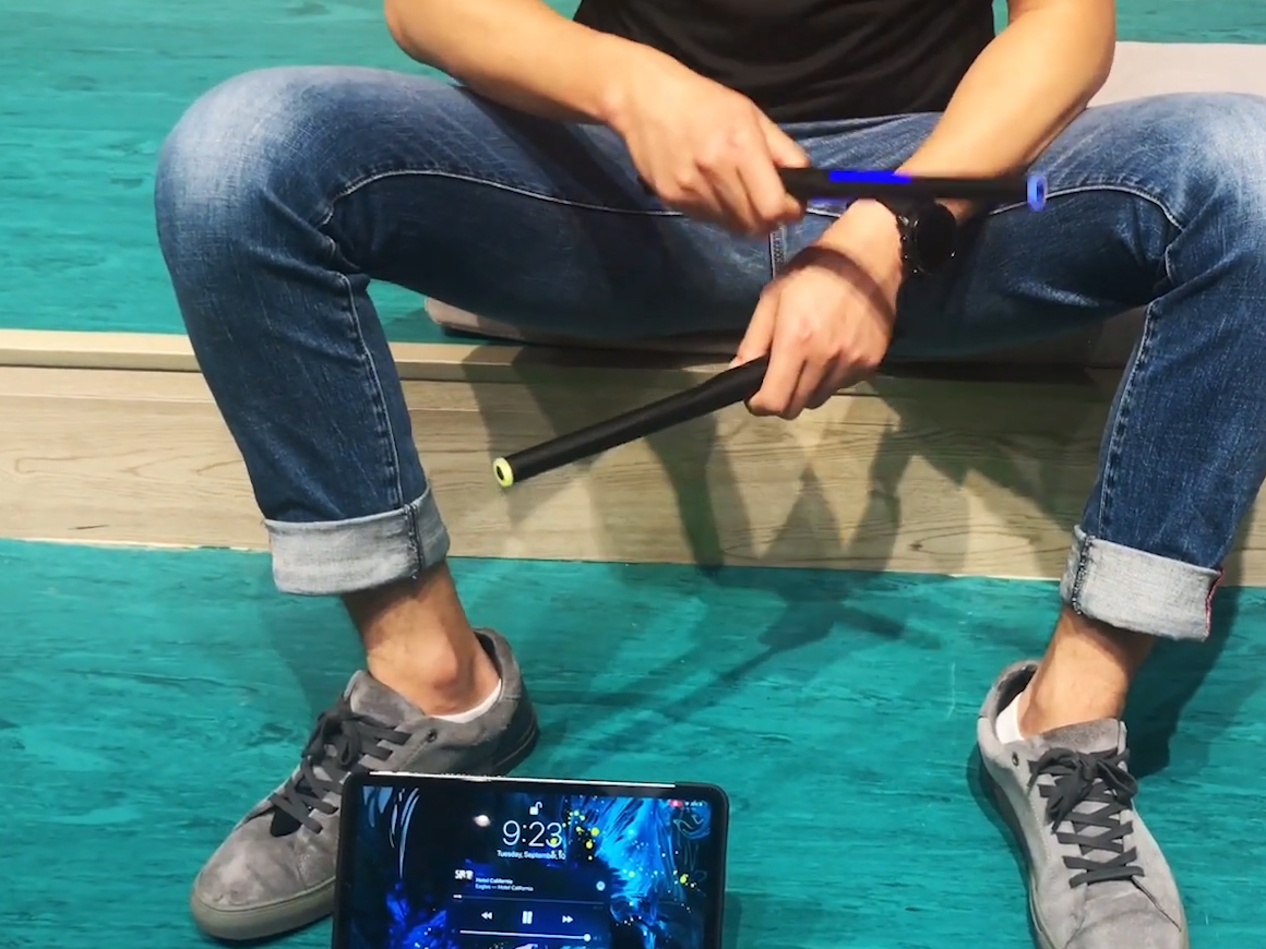 「Pocket Drum」は専用のアプリにつなげば、叩く面がないエアドラムでも、ドラムセットの音が再現できるドラムスティック。