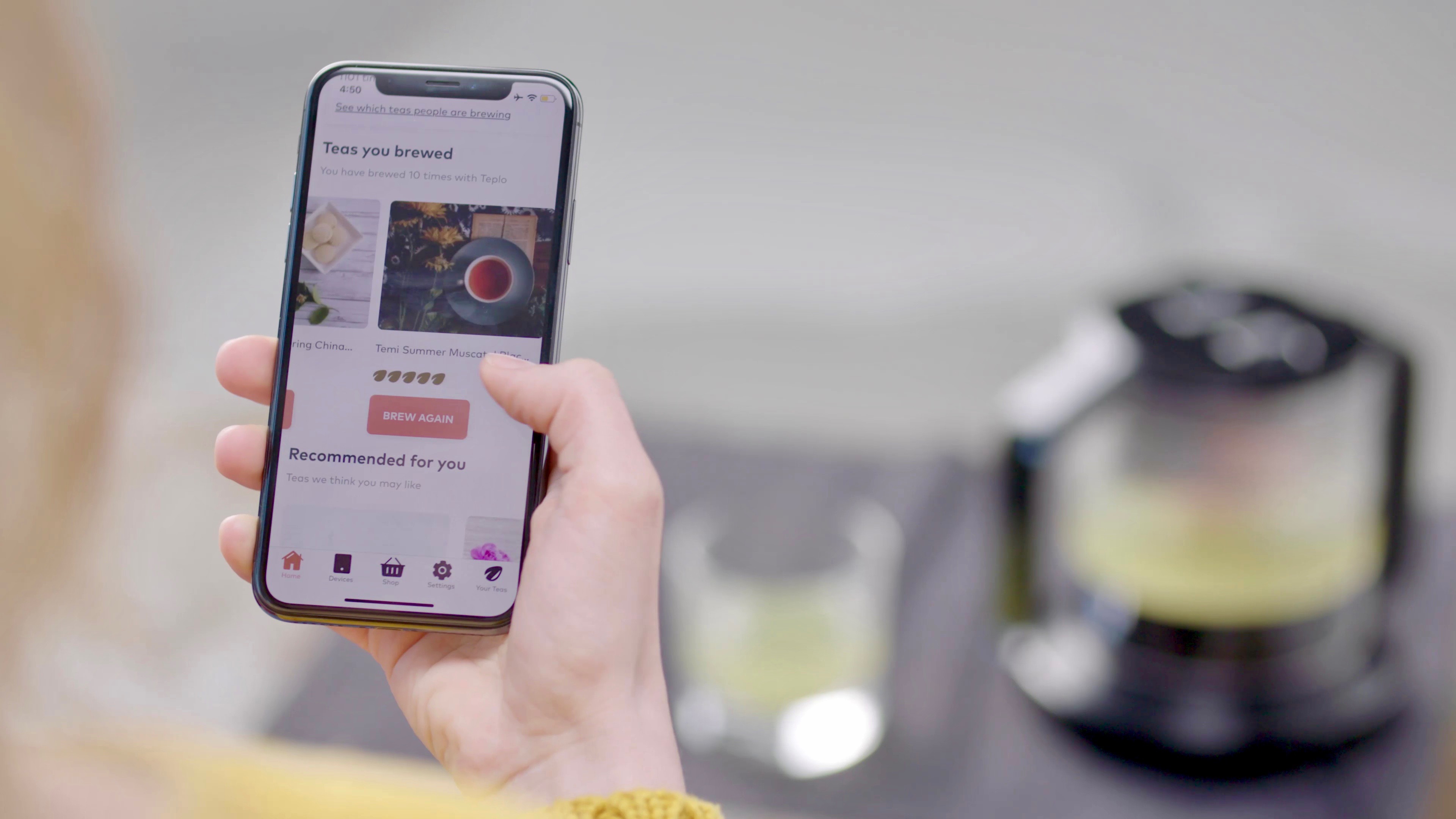 Teploのアプリは、データベースから好みのお茶を選んで最適な抽出条件を設定できるだけでなく、抽出履歴や好みに基づきおすすめされたお茶のブレンドを、アプリから購入可能。