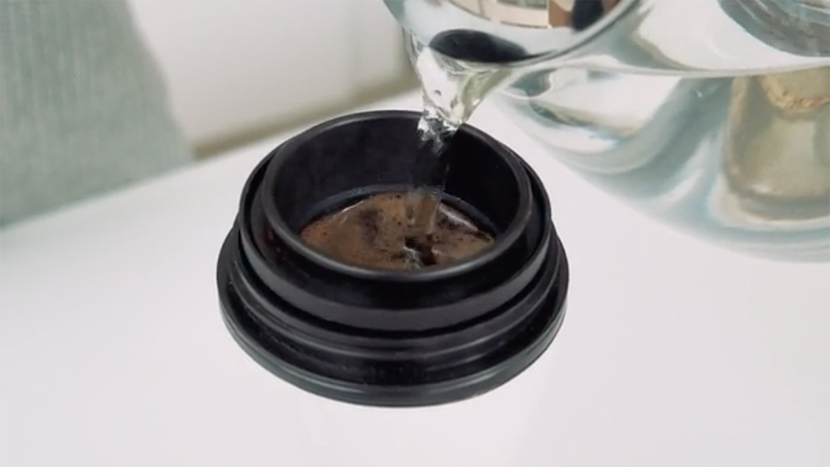 淹れたコーヒーは、本体を逆さにして反対側の口からいつでも味わうことができる。