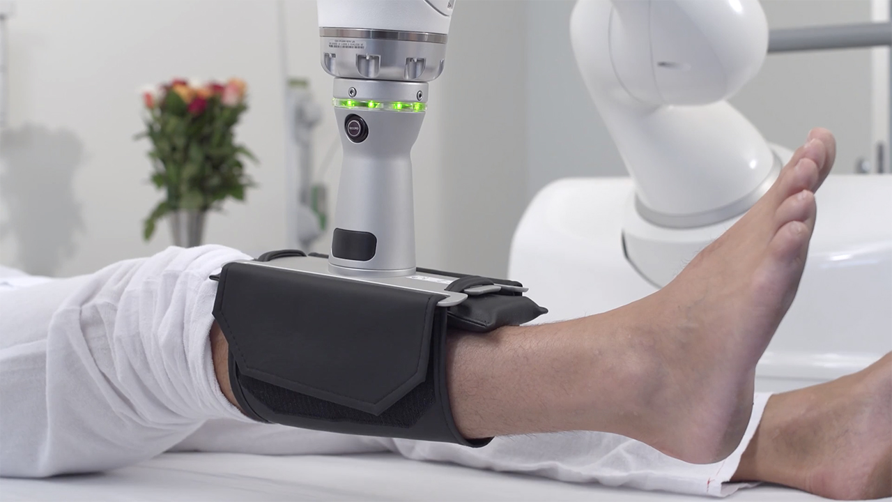 操作手順もシンプルだ。まず患者の下肢にベルトを装着し、本体の位置を調整してキャスターをロック。装着したベルトと本体のアームを結合させる。