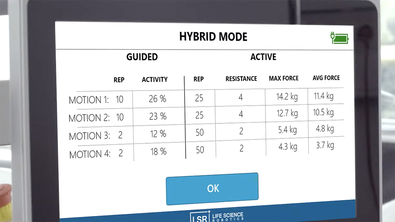 動きは4種類まで連続で記憶でき、さらに「Guided(受動)」「Active(能動)」「Hybrid(受動+能動)」の3つのモードを選択可能。患者それぞれに適したリハビリテーションプログラムを1回につき40分程度まで設定できる。
