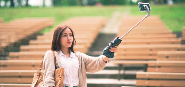 「スマホ傘」の持ち手に装着したスマホは、ぐりぐりと動かして自由な角度に見やすく固定できる。この可動域の広さと傘の柄の長さを活かして、自撮り棒やスマホスタンドとしても使える。