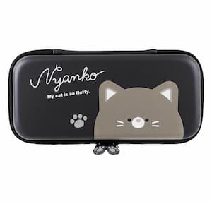 猫の顔をデザインした薄型のスイッチ専用ケース。立体的な耳は、ファスナーを開けたときにケースのふたを支える実用的な役割も。