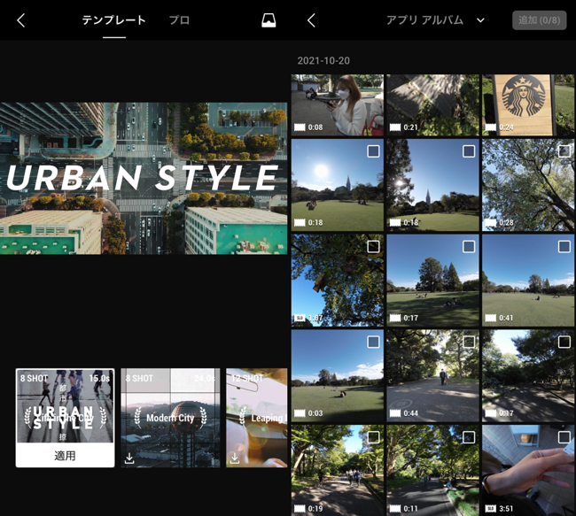 動画内では詳しく紹介できませんでしたが、DJIのスマホアプリ「DJI Mimo」と接続することで、データを転送し、アプリ内で編集もできます。テンプレートを選ぶとAIがいい感じに編集してくれる機能を使うと、データ転送時間を除いて、ものの3分ほどで30秒ほどのいい感じの動画が出来上がります。
