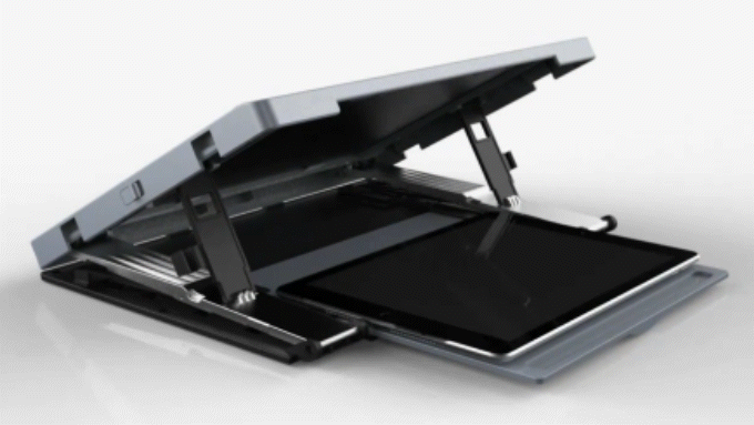 スタンドの中に薄型PCやタブレットを収納することもできて、あっという間に丈夫なタブレットケースに変身だ。