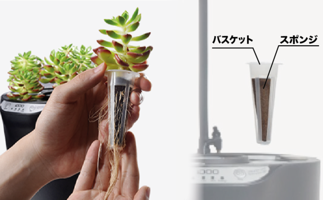 用途に応じて土耕栽培にも対応している。本体上部に土を入れ、下部のタンクからコットンの紐を通じて土壌に水分を提供できる設計。