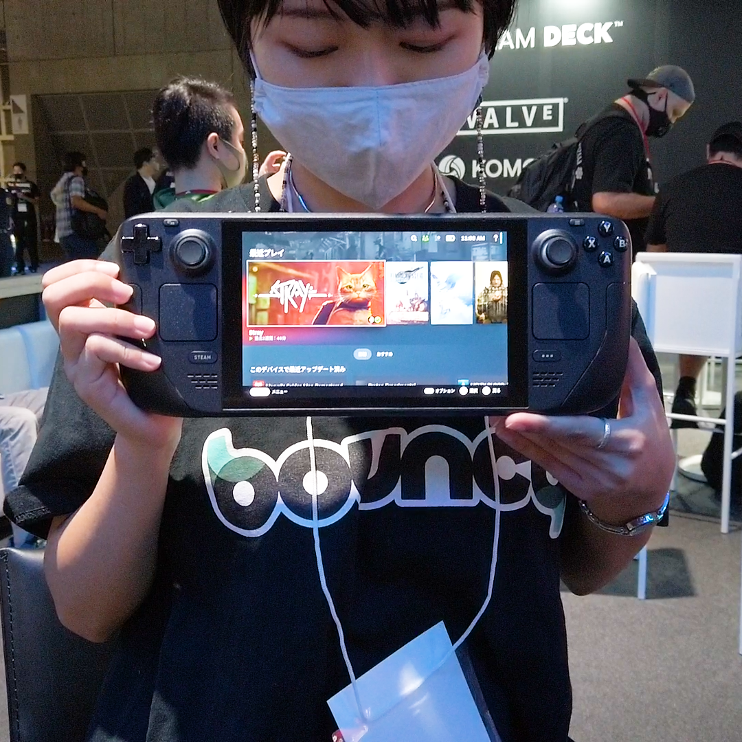 今回の注目は携帯ゲーミングPC、Steam Deck。体験ブースで「ELDEN RING」や話題の猫を操作するゲーム「Stray」などを15分間プレイできます。重さや大きさなど、映像では伝わらないことが体験できます。