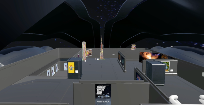 また、メタバースならではの面白い設定で展示空間を盛り上げられるのも魅力だ。例えば、今回のエキシビジョンのメタバース上のギャラリーは、惑星に漂着した宇宙船という設定。ゲストは、宇宙船内やその周辺に点在するスペースデブリに展示された作品を自由に見て周れる。