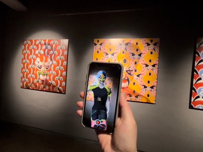 ORLAN の作品は、キャンバスに描かれた京劇の仮面とインタラクティブテクノロジーを組み合わせたもの。一見通常の絵画のようだが、QRコードをスキャンすると作者自身のアバターがスマホの中に現れてアクロバットをする。中国の古典演劇である京劇では、女性が演者となることが歴史的に禁じられてきた。その京劇の仮面をフェミニストである作者自身が身につけてARでパフォーマンスをするという、興味深いメッセージが込められている。
