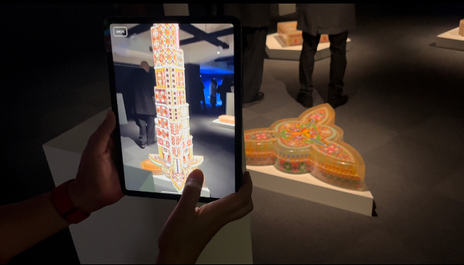 Elisa Insuaの作品。ギャラリーには賞味期限の過ぎた飴で作られたオブジェ(立体作品)が幾つか飾られている。タブレットをかざすと、オブジェがニョキニョキと伸びて高層ビルが立ち上がる。ビルは、世界で最も高級な私邸「アンティリアハウス」、世界一の高さを誇る「バージュ・カリファ」、経済力の象徴とされる「トランプタワー」の3棟だ。