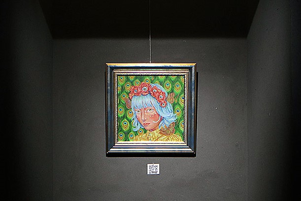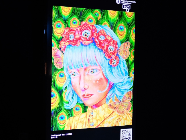 色鉛筆アーティスト、咲の作品。今回は、キャンバス版とデジタル版の両方が展示されていて、この二つを見比べるのも面白い。テーマは「視線」。普段観られることの多い絵画、そしてその中に描かれた花や蝶。この作品では、これらが逆にオーディエンスを見返してくる。NFTアートにすることで、目玉がギョロリと動いたり蝶が羽ばたいたり、キャンバスと比べて視線の表現がより強調されている。