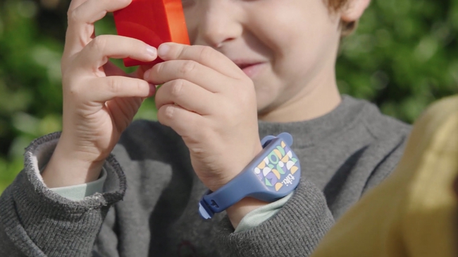「ブレスレット」は、子供が身につけるセンサー。ボタン電池で稼働する。防水仕様で、距離・水・転倒を感知するセンサーを内蔵。