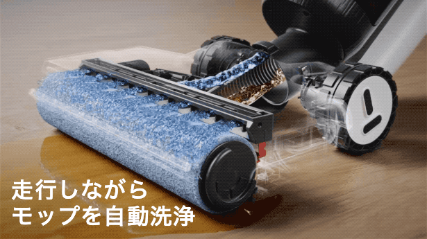 床拭きのモップは、毎分450回、回転する。床を水拭きしながらモップも洗うので、いつもキレイな状態で水拭きができる。また、スタンドに立ててボタンを押すだけで自動でモップを洗い、冷風乾燥もしてくれる。