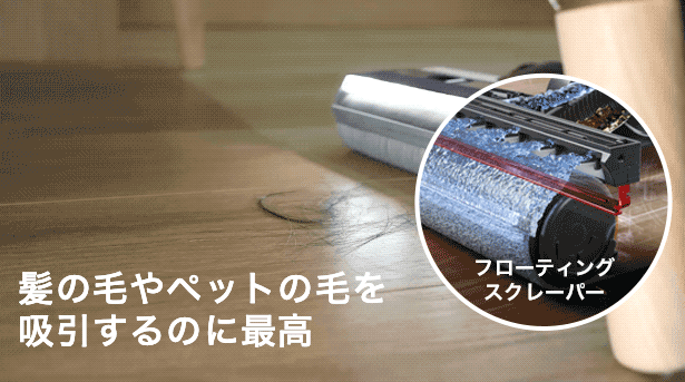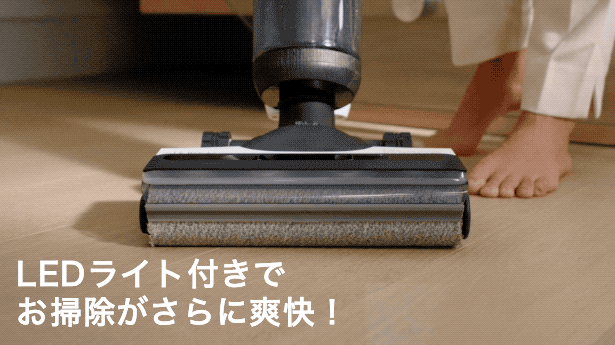 吸引口はゴミや髪の毛が絡みにくい仕組みになっている。左右に隙間が出来にくい作りにもなっていて、狭いところや部屋の四隅も掃除が可能。また、LEDライト付きで、暗いところでも目で確認しながら掃除ができる。