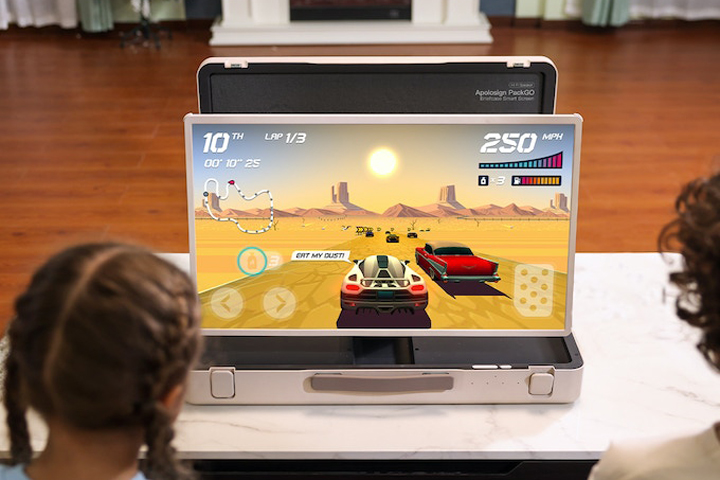 「PackGo」は、好きな場所に持ち運んで映像や音楽を楽しめるアタッシュケース型のスマートディスプレイ。