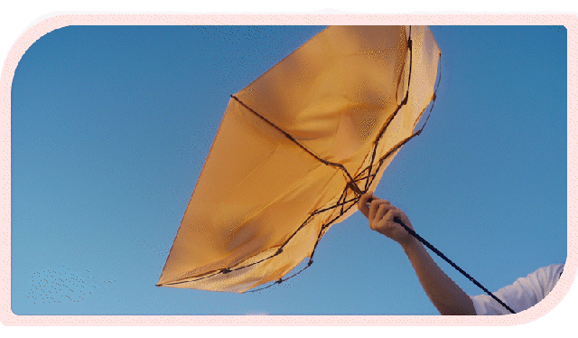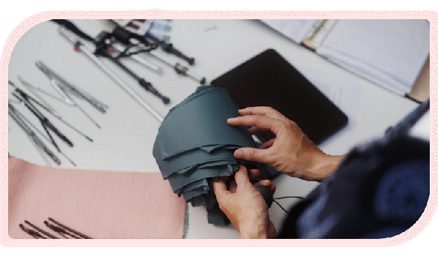 傘の布部分についた独自のパッチが、シワがつきにくく、折りたたむときに傘表面を固定し巻き取りやすくする。はっ水加工で水切りしやすく、UVカット加工もされているため日傘としても利用可能。
