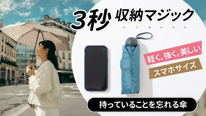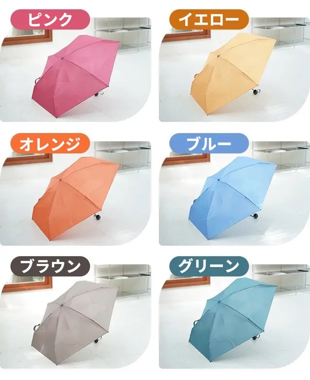 傘の弧長は約102cmで、折りたたむと寸法は約5.5×5.5×18.5cmになる。重量は約220gで、カラーはピンク・イエロー・オレンジ・ブルー・ブラウン・グリーンの6種類展開。