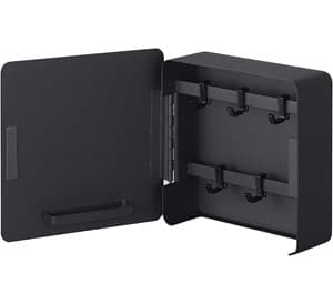 玄関のドアに、マグネットで貼り付けて設置するアイテム。扉付きなので鍵を隠して収納でき、5つあるフックは自由に脱着できます。印鑑用のトレーも備わり、宅配便を受け取る際に役立ちます。
