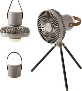三脚スタンドが付属し、地面に置いて使用するのに便利です。吊り下げられるので、テントの上からも風を送れます。