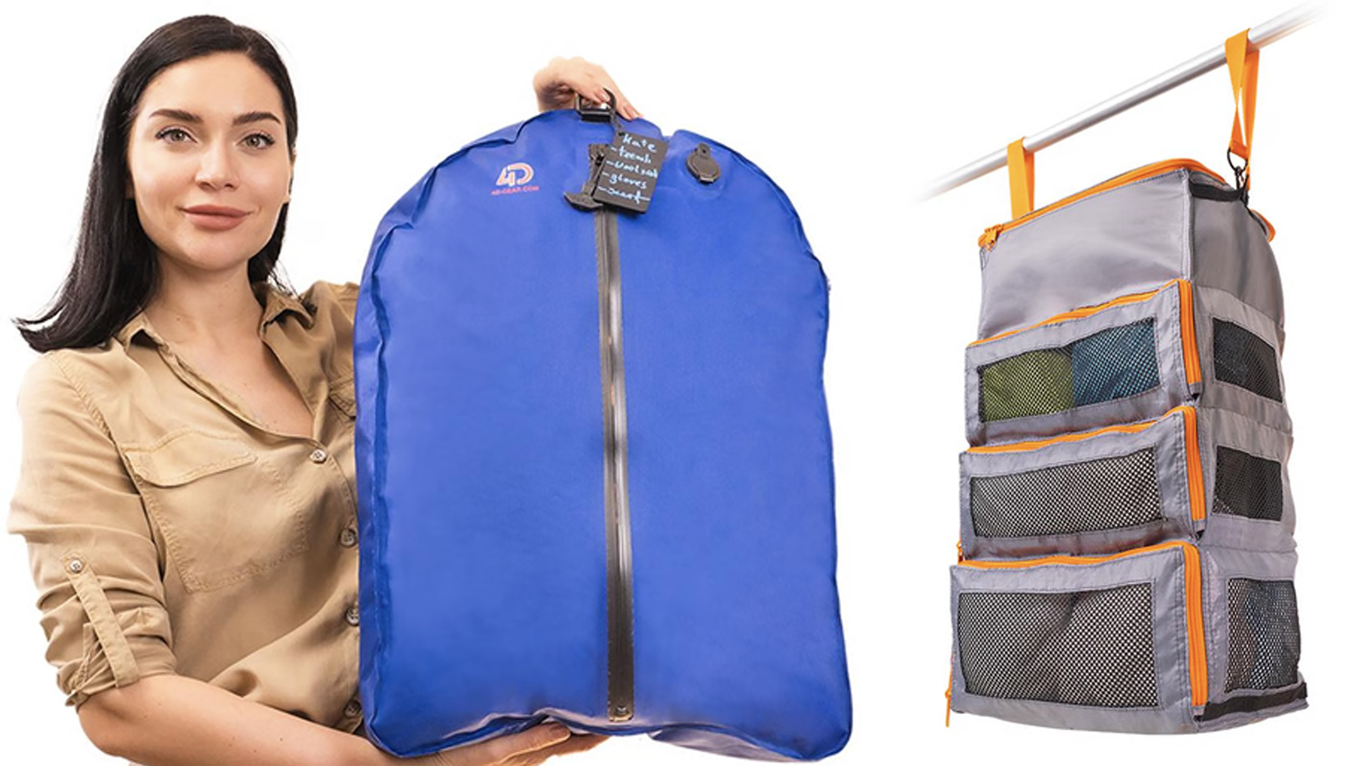 「4D Pack Plus」は、荷物の出し入れがしやすいジッパー型の圧縮ポーチ。小分け収納付きで、ポーチから取り出し、そのままワードローブに吊せる。