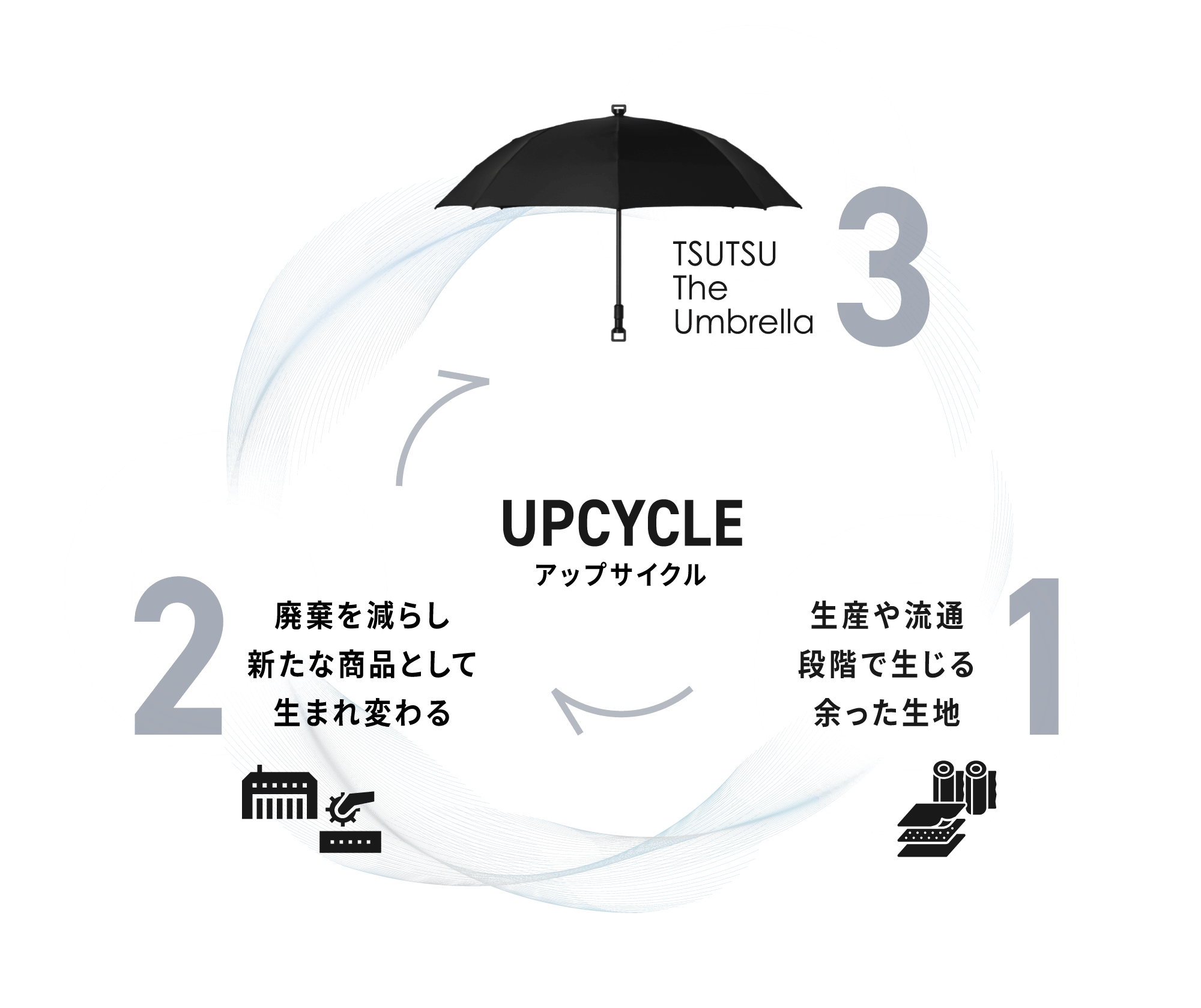 「TSUTSU The Umbrella」は傘地にアパレル製品に使用されるナイロン6を使用。生産や流通段階で生じる余った生地を、傘地に再利用することで廃棄される量を減らす。