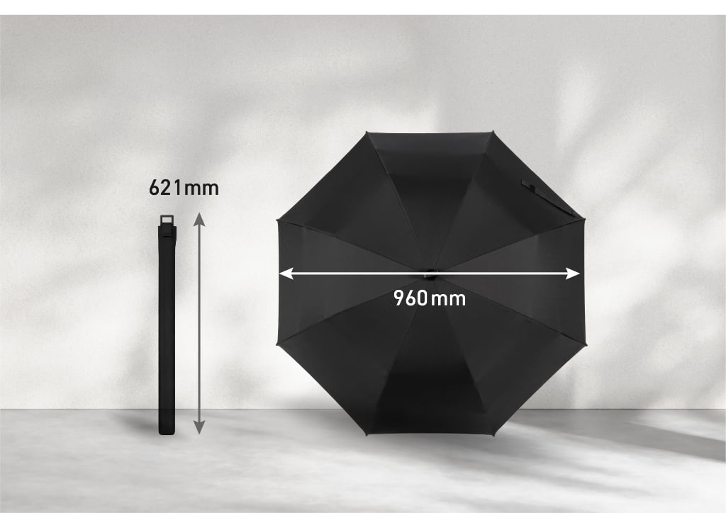 「折りたたみ傘以上 、長傘未満」のサイズで設計されており、重量は約230g。