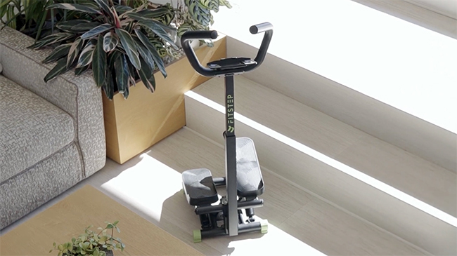 「FITSTEP」は持ち手部分を搭載し、ハンドルを掴みながらの下半身運動と、ハンドルを掴まない全身運動が可能。ステップ回数・時間・消費カロリーなどはスクリーンで確認できる。