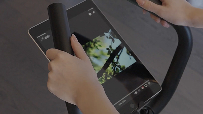スマホやタブレットを置けるホルダーも搭載し、動画コンテンツなどを楽しみながら運動できる。専用エクササイズバンドも付属。