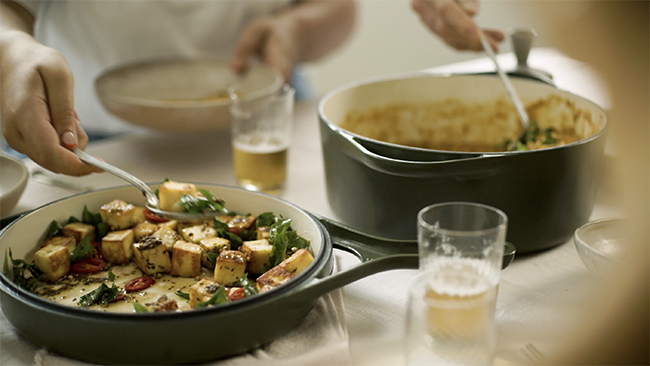 「Foundry Pan」は熱伝導性と耐久性に優れる鋳鉄製。素材にムラなく火が通り、できたて熱々をそのまま食卓に出せる。